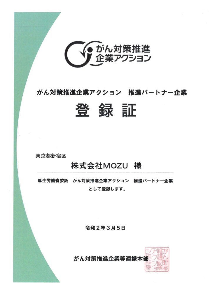 「厚生労働省委託 がん対策推進企業アクション 推進パートナー企業」として登録されました。